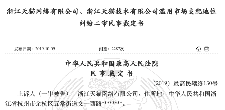 近日,中国裁判文书网发布的一则裁定书,让京东起诉天猫滥用市场支配地位一案的管辖权异议问题有了结果。