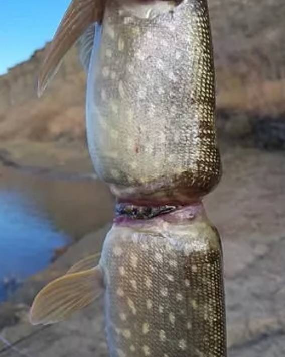 加拿大安大略省的萨尼亚人,Adam Turnbull和朋友在加拿大艾伯塔省的萨斯喀彻温河畔钓鱼时,发现了一条奇怪的鱼。这条鱼的躯干约中央的位置,像莲藕一样的断开连在一起。这条鱼应该是被不明的什么东西束缚在了身上,躯干被强行断开。